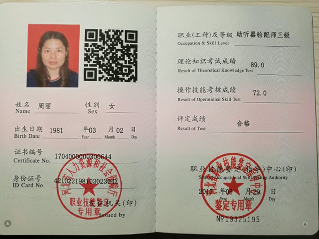 2017年獲得國家認證助聽器三級驗配師證書