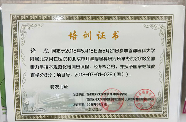 簡介:8年助聽器驗配經驗,尤其擅長兒童助聽器驗配和聽力言語康復,多次參加各大國際品牌資深驗配師培訓并獲得金牌驗配師證書,2018年5月18日至5月21日參加首都醫科大學附屬北京同仁醫院和北京市耳鼻咽喉科研究所舉辦的2018全國聽力學技術規范化培訓班課程,經考核合格,并授予培訓證書。